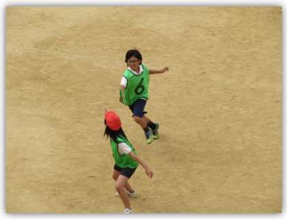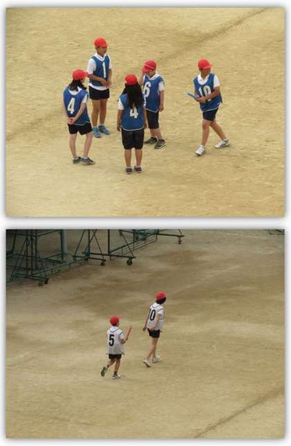 6年生の体育の学習です。リレーのバトンの受け渡しの練習を、チームごとに行っています。