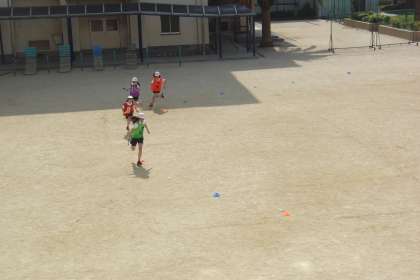 6時間目、6年2組が運動場で体育をしています。チーム対抗リレーで、懸命に走っています。