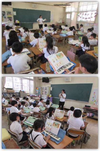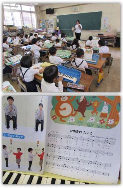 2年生の音楽の学習です。1組は、鍵盤ハーモニカで『たぬきのたいこ』の演奏に取り組みました。