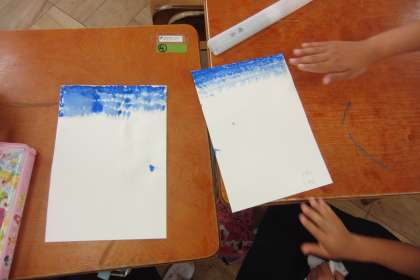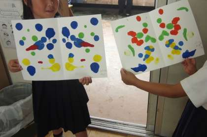 今日、2年生は図工で絵の具の勉強をしました。同じ色でも、加える水の量で感じが変わることを学んだり、絵の具の足し算で新しい色が作れることを学びました。また、紙に絵の具を塗ってその紙を閉じ、開くと面白い模様ができること(デカルコマニー)も楽しみました。。