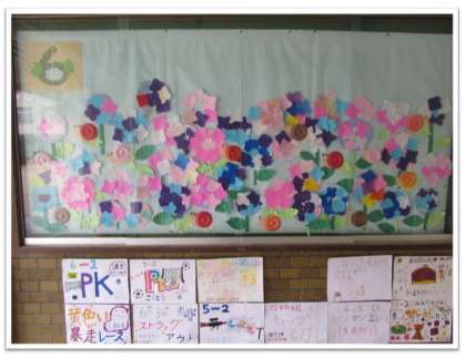 6月になりました。6月の玄関掲示は、6年生の作品です。色とりどりのアジサイが、咲き誇っています。