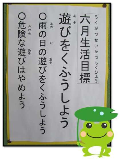 6月の生活目標です。今月の目標は『遊びをくふうしよう』です。具体目標は、