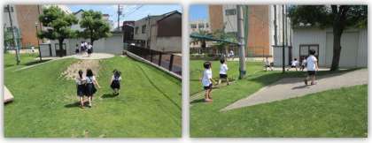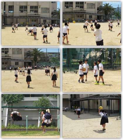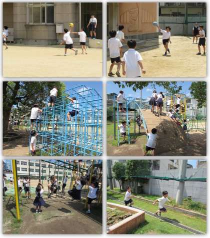 校内一斉清掃が終わり、お昼休みになりました。子どもたちが運動場に出て、元気に遊んでいます。