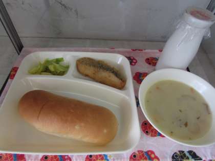 本日の給食の献立をご紹介します。本日の献立は、おさつパン、牛乳、サーモンフライ、豆乳コーンスープ、キャベツのカレーソテーでした。