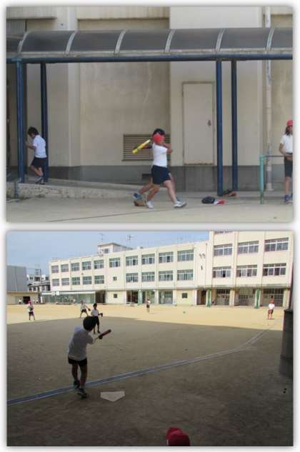 6月4日(月) 6年生の体育の学習です。ソフトボールのバッティング練習をしています。