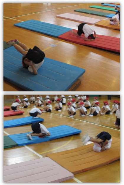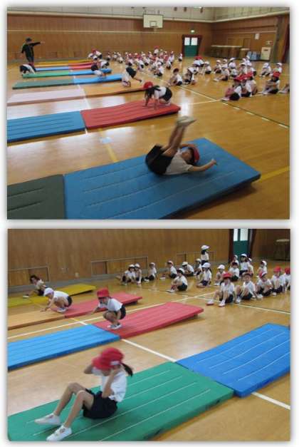 1年生の体育の学習です。マットで、前回りや後ろ回りに取り組みました。マットの下にロイター板を入れて傾斜を作り、回りやすくなっています。