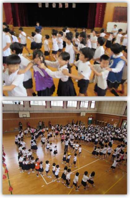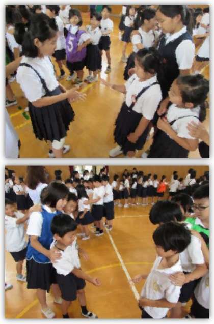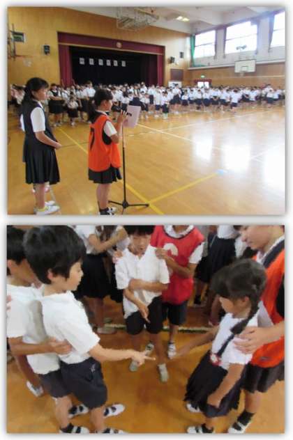 木曜日の朝、児童集会の様子をご紹介します。本日の集会は、集会委員会による『じゃんけん列車』です。初めはペアの2人ですが、じゃんけんを繰り返すうちに、長い長い列が出来上がりました。