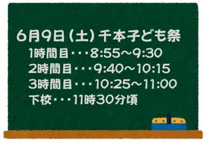 明日6月9日(土)は今年度1回目の土曜授業です。千本子ども祭を行います。1年生から6年生までの各クラスがお店を出し、子どもたちは店番をしたり、ペア学年でお店を回ったりします。普段の学習の様子とは違う、子どもたちの活躍の様子をぜひご覧ください。