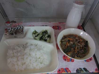 本日の給食の献立をご紹介します。本日の献立は、ご飯、麻婆春雨、ミックス海そうのサラダ、アーモンドフィッシュ、牛乳でした。