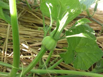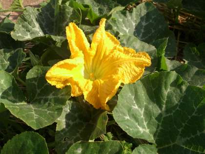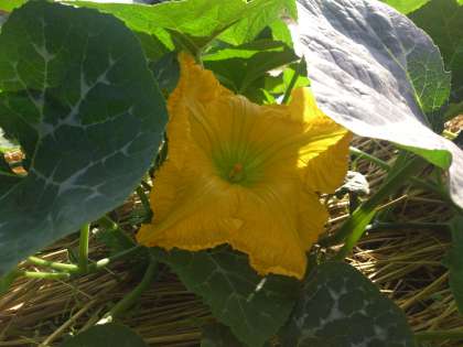 5年生の学習園では、「なにわの伝統野菜」、勝間南瓜を育てています。5年生の子どもたちが毎日、水やりをしたり、観察をしています。昨日、5年生の子どもが職員室に来て、「勝間南瓜の花が咲いています。」と、教えてくれました。学習園に行ってみますと、黄色い、大きな花がいくつも咲いていました。咲いているのは、どれも雄花でしたが、葉っぱの下をのぞいてみると、小さな雌花のつぼみも見つかりました。