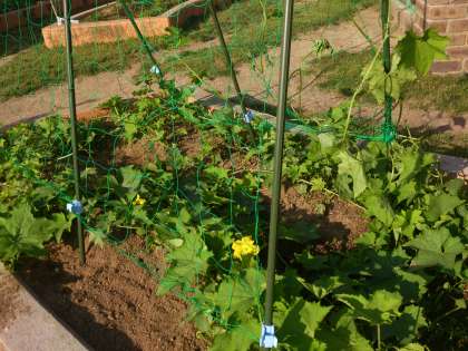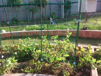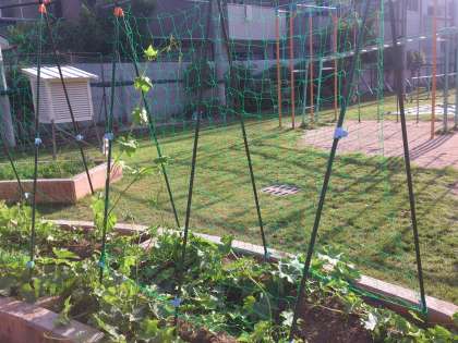 4年生の学習園のヘチマやヒョウタンもずいぶんと伸びてきましたので、支柱を立てました。ヘチマもヒョウタンも、喜んでネットにひげを巻きつけて、背伸びをしています。見てみると、ヘチマにはもう、花が咲いています。