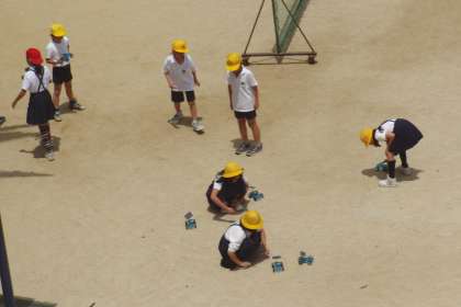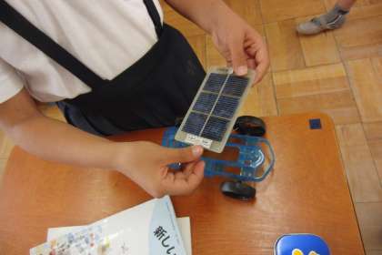 4年生の理科の学習の様子です。光電池を使った学習をしています。光電池とつなぐと、乾電池もないのに、車がそろそろと走りました。その様子に、子どもたちも歓声を上げていました。