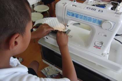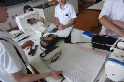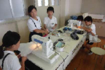 5年生は家庭科で、ナップザック作りに取り組んでいます。初めてのミシンを使った学習です。ミシンがうまく動かなかったり、糸がからまってしまったり、でも、そんなときにも友達と助け合って頑張っています。