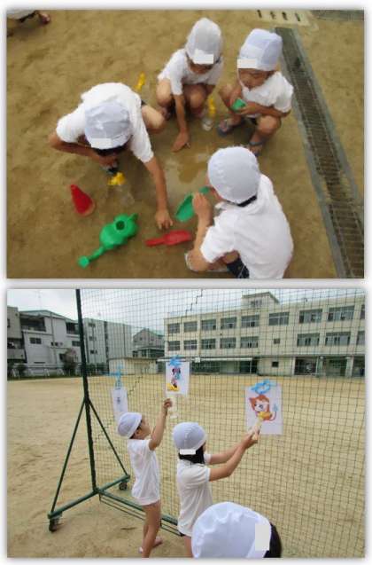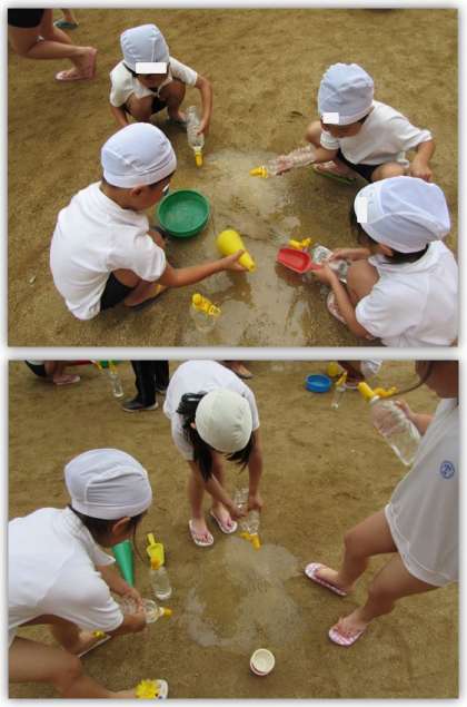 ペットボトルやバケツ、スコップなどを使って、泥んこ遊びを楽しみました。本日、水着を持ち帰っています。6月14日(木)に持たせてください。体操服を持ち帰っている場合、明日、体育がありますので、持たせてください。