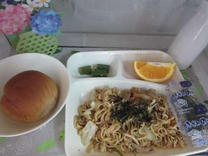 本日の給食の献立をご紹介します。本日の献立は、黒糖パン(小)、焼きそば、オクラの中華和え、オレンジ、刻み海苔、牛乳でした。