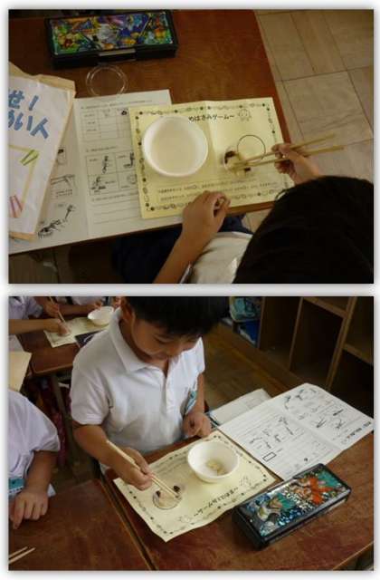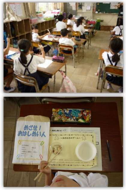 本日、北津守小学校の栄養教諭の方にお越しいただき、2年生の食育を行いました。本日のテーマは『おはし名人になろう』です。子どもたちは、正しいお箸の持ち方がなぜ大切なのか、正しいお箸の持ち方とはどんな持ち方なのかということを学びました。そして、正しいお箸の持ち方で、豆つかみにチャレンジしました。
