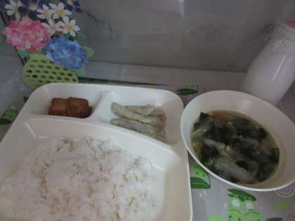 本日の給食の献立をご紹介します。本日の献立は、ご飯、いわしてんぷら、五目汁、厚揚げのしょうがじょうゆかけ、牛乳でした。