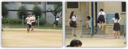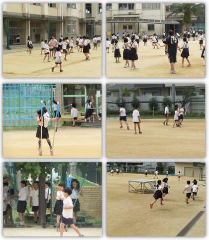 お昼休みになりました。子どもたちが運動場に出て、元気に遊んでいます。