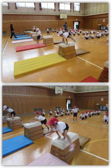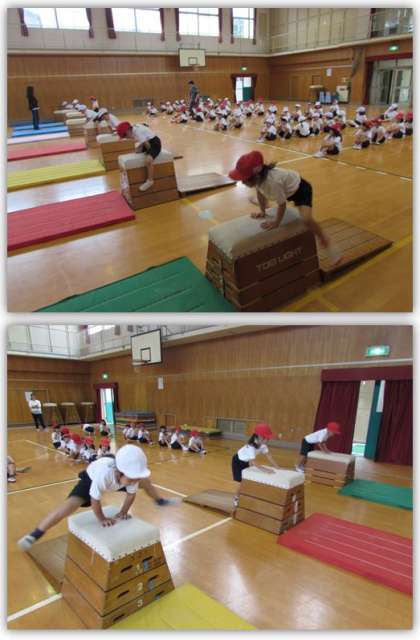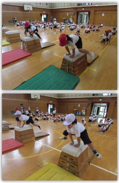 1年生の体育の学習です。今日は跳び箱を使った運動に取り組みました。跳び箱・ロイター板・マットを班で準備しました。跳び箱をまたいで跳び越える運動を行い、次第に手をつく位置を遠くにしていきました。