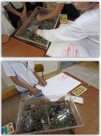 2年生の図画工作の学習です。絵を描く前に、触ってみて、表面の様子などを確かめています。