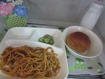 本日の給食の献立をご紹介します。本日の献立は、黒糖パン(小)、スパゲッティミートソース、きゅうりのバジル風味サラダ、牛乳でした。