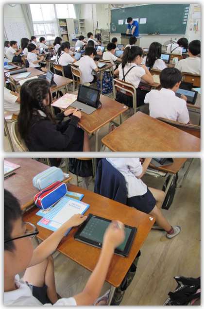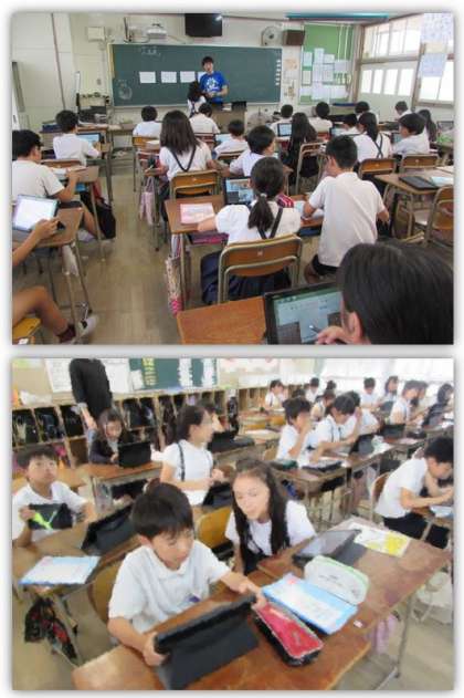 5年生の総合学習の様子です。タブレットを使って、林間学習で行く『鉢高原』について調べました。