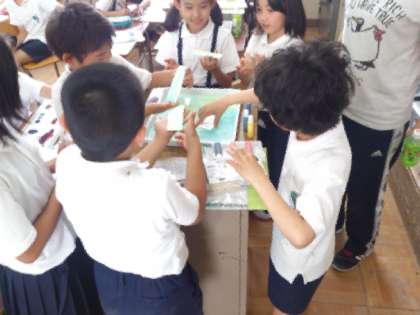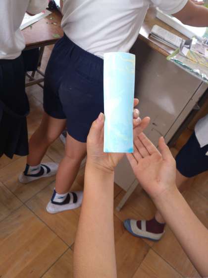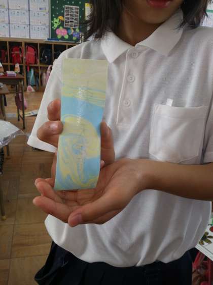 今日の5時間目、4年生がしおり作りに取り組みました。水に絵の具を浮かべてそれを紙に写し取る「マーブリング」という技法を使いました。