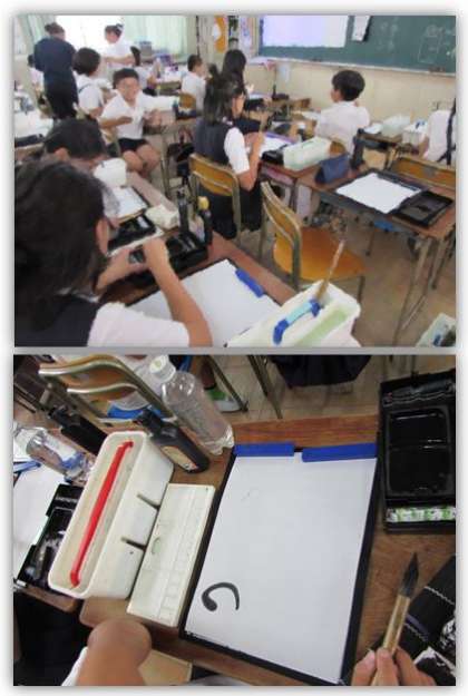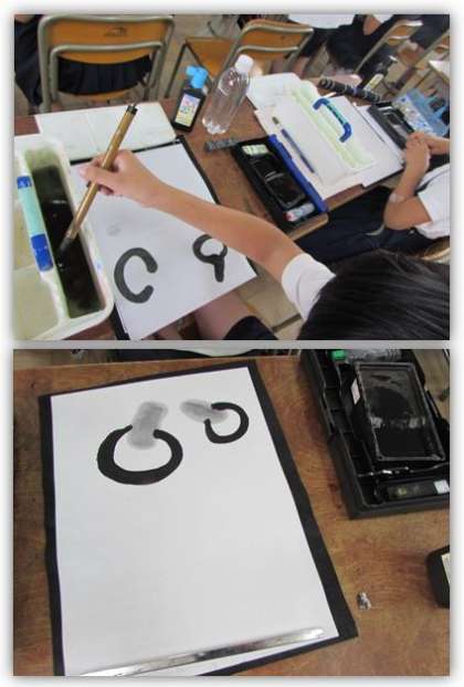 6年生の図画工作の学習です。墨液を使い、水墨画にチャレンジしました。初めにまず、しいたけを描いてみました。くるり、と丸い線を描きます。
