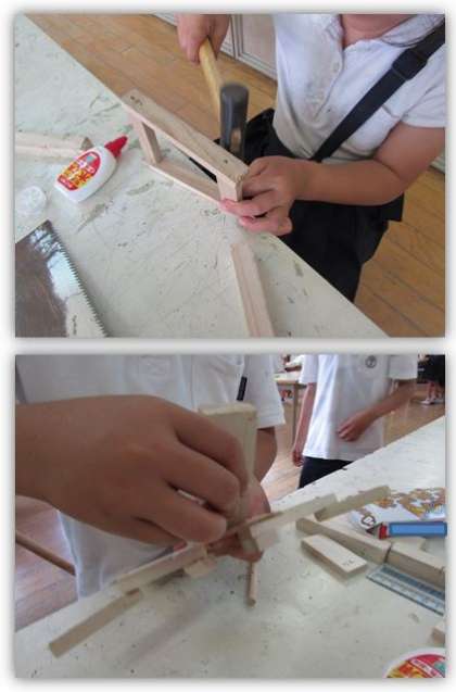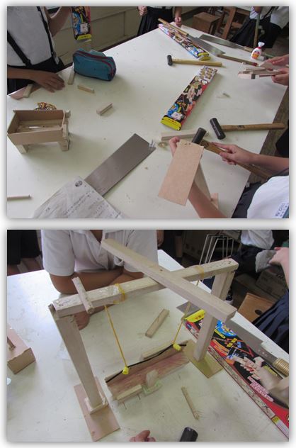 3年生の図画工作の学習です。材料の木をのこぎりで切り、くぎを打って、「自分が作ってみたいもの」を作りました。