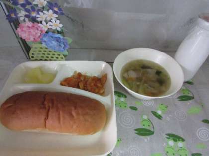 本日の給食の献立をご紹介します。本日の献立は、黒糖パン、えびのチリソース、中華スープ、りんごの缶詰、牛乳でした。