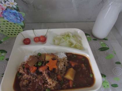 本日の給食の献立をご紹介します。本日の献立は、ハヤシライス、キャベツのゆずドレッシング、さくらんぼ、牛乳でした。
