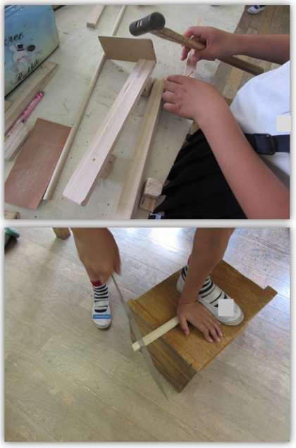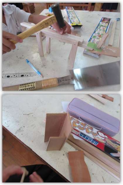 3年生の図画工作の学習です。図工室で、材料を切り、釘を打って、組み立てていきます。