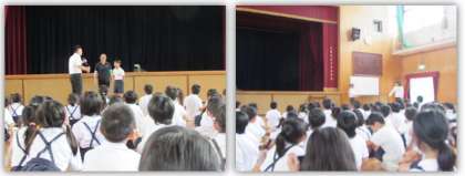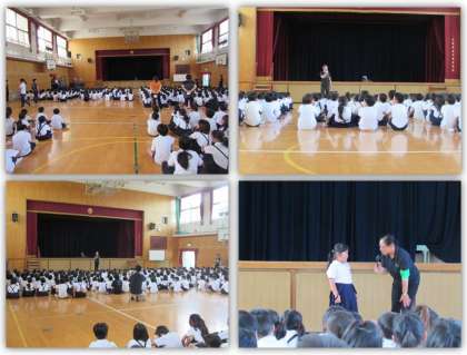 不審者が侵入したとの設定で、職員が対応にあたりました。侵入者が取り押さえられたとの連絡の後、児童は体育館に集合しました。西成警察の方からは、事件に巻き込まれないために、「できるだけ1人にならない」「危険な目にあいそうになったら、大きな声を出す」「大きな声を出すとともに、その場から逃げる」の3点が大切であると、お話ししていただきました。