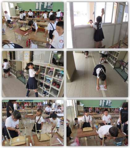 給食が終わって、全校一斉清掃です。1年生も、教室や廊下を、ぴかぴかにしようと頑張って掃除をしています。