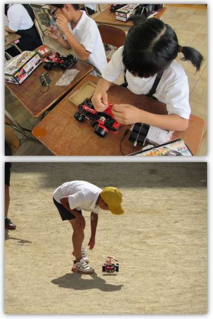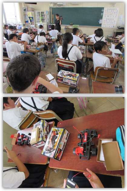 4年生の理科の学習の様子です。モーターカーに光電池を積んで、走らせました。