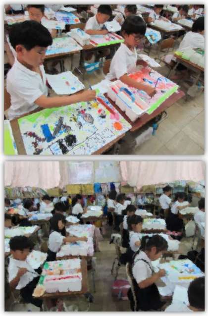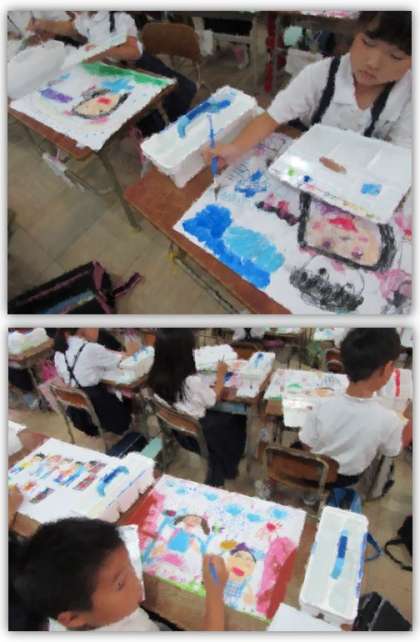 1年生の図画工作の学習です。今日は絵の具を使って、絵に色をつけました。道具の置き方、筆洗の使い方、絵の具をパレットに出す量などを確かめ、いよいよ筆を持って絵に向かいました。筆にたっぷりと水をつけ、色をつけていきました。