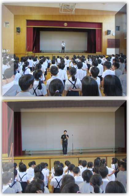 続いて、学校長から、この1学期の朝会では、みんなのできるようになったことをたくさん紹介できました、2学期もまた、たくさん紹介できるようにしたいです、という話をしました。