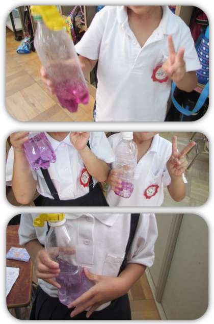 1年生の生活科の学習です。鉢で育てているアサガオの花を使って、色水作りをしました。花と水をビニール袋に入れて、花をよく揉むと、水がきれいな色に染まりました。