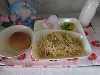 本日の給食の献立をご紹介します。本日の献立は、黒糖パン(小)、牛乳、シーフードトマトスパゲッティ、グリーンアスパラとコーンのサラダ、発酵乳でした。