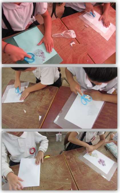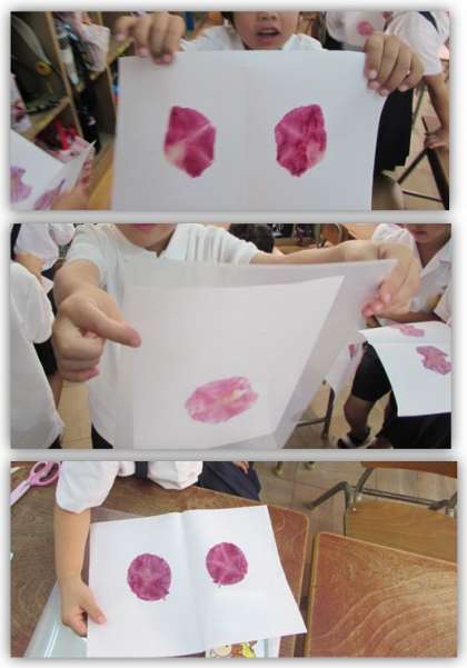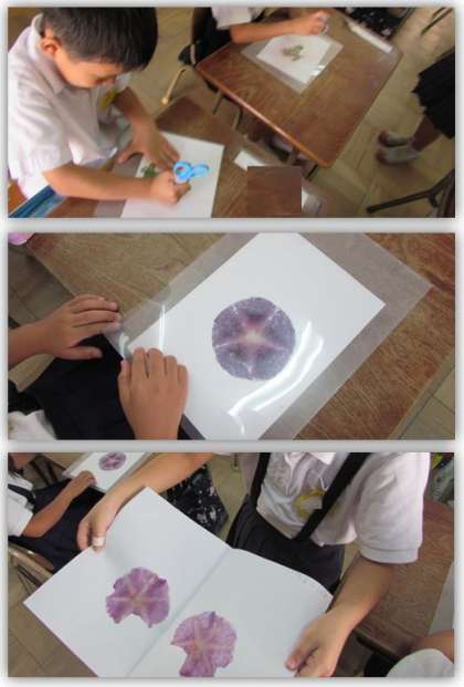 1年生の生活科の学習です。今日はアサガオの花や葉を、半紙に挟み、それをクリアファイルに入れてはさみの柄でこすりました。紙を広げると、花や葉が、きれいに写しだされていました。