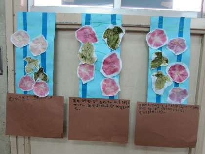 1年生はアサガオの花や葉を使って、たたき染めをしました。そのたたき染めをした紙を切って、鉢に模した紙に貼りつけました。鉢の部分には、アサガオの花が咲いてどんなことを思ったのか、書きました。