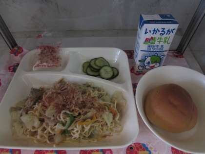 本日の給食の献立をご紹介します。本日の献立は、黒糖パン(小)、牛乳、和風焼きそば、きゅうりのゆず風味でした。