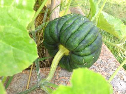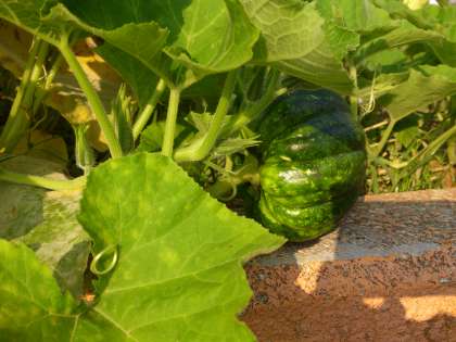 5年生の学習園の勝間南瓜です。ぼこぼこっとした形になり、ずいぶんとカボチャらしくなってきました。
