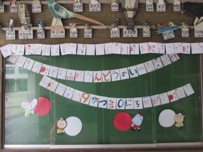 画像は、9月の玄関掲示です。3年生が作った作品を掲示しています。