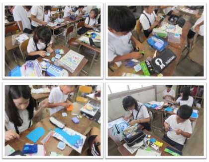 5年生の家庭科の学習です。フェルトを使って、ペンケースや小銭入れなどの小物を作りました。