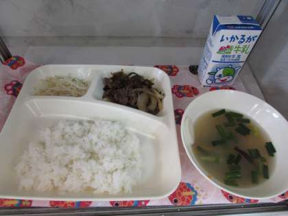 本日の献立は、ご飯、プルコギ、トック、もやしの甘酢和え、牛乳でした。