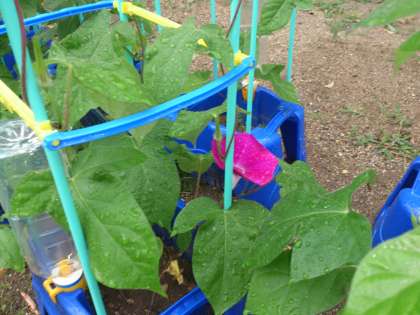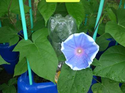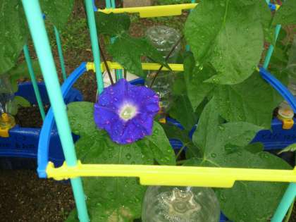 久々の雨です。1年生のアサガオの花が、雨に濡れています。
