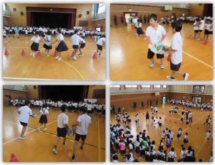 木曜日の朝は、児童集会から始まります。本日の集会は、ボール運びリレーです。新聞紙の上にボールを乗せて運び、何周できるかを競いました。