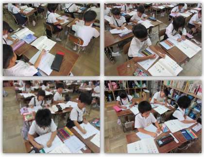 1年生の国語の学習です。教科書99ページの絵入り文を読んだり、絵の部分を漢字に変えて文を書いたりしました。