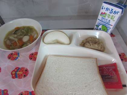 本日の献立は、食パン、牛乳、いちごジャム、揚げ餃子、中華煮、梨(豊水)でした。